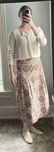 I’ve always liked block prints and batik, and I loved this skirt. Put it on and immediately went to check the site to see if I could afford to buy it (no, no I can’t). The price surprised me, actually, because it’s not lined, and no pockets; it’s a beautiful print but a pretty simple little skirt. Fabric is lightweight, good for warmer weather.