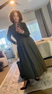 I absolutely love this dress—it’s the perfect fall piece. Since it’s also a sweater dress, it feels cozy for those chilly mornings on the way to the office. The fit is very comfortable, and having pockets is a big win—I can easily carry my phone while I’m on rounds at the hospital. There’s no need for Spanx, which is always a plus. And that’s really what seals it: comfort + style = a win. If I rent again, I’ll pair it with boots for a different look. I also adore the olive color—it’s versatile and seasonally elegant.