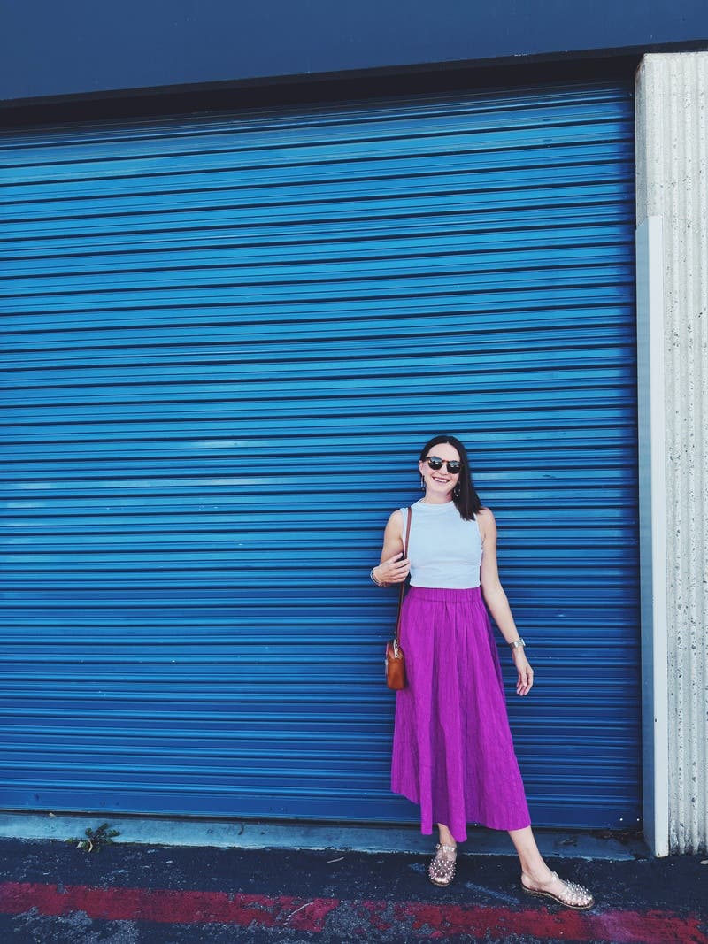 This vibrant Marie Oliver skirt features a textured crinkle effect and a flowing midi silhouette, lending a playful yet sophisticated vibe. Pair it with a fitted top and strappy sandals for a chic, summer-ready look.