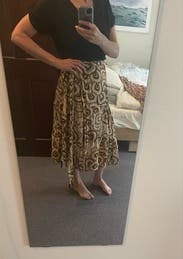 Fully expected to love and buy this skirt but after the first wear i knew i wouldn’t. Very comfortable but the slit/tie combo is challenging. First time i wore was in Toronto and it was super windy and i had to keep adjusting it and holding it while walking to keep from flying up. Second time was at home and wore out to a patio and even sitting down the slit just like comes all the way open and up. Something in the construction of this piece is missing.