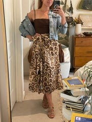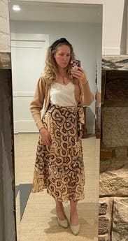Wore to work, but also considered wearing it with a brown tank to a dinner! Super cute and easy to adjust given it’s a wrap skirt! Love the tassels at the end of the ties!