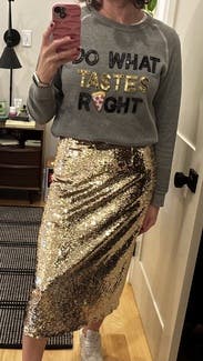 Obsessed beyond with this skirt!! I wore it in NYC & walked around and it was a perfect fit. I could have dressed it up more with different tops or sneakers & a t shirt. So much sparkles & so fun!