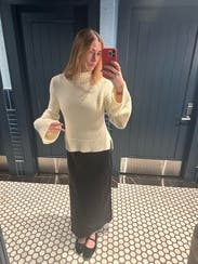 This is a lovely cream sweater. The bell sleeves and longer cut in the back give it a nice look. Fabric isn't super soft, but still comfy. Only issue is trying to tuck front into pants/skirt. Leaves a little budge but looks lsoopy completely out.