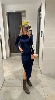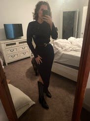 This dress is the perfect length that you can wear it for multiple settings - work, GNO, weekend brunch, or for date night. Total hit, sweater dress material and fit, warm and thick. Total stunner with added slit.