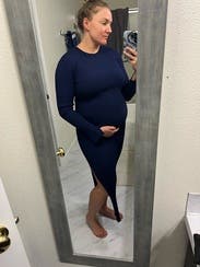Wore this dress to my baby shower in the 3rd trimester (29 weeks) and it fit perfectly! Very comfortable and flattering. Received so many compliments!