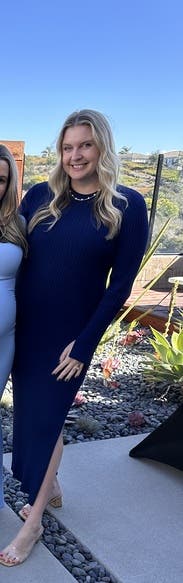 The ribbing is structured just enough in this dress to smooth and also contour. The sleeves have beautiful openings at the wrist for just a little touch of interest. Moderate slit and a great midi length!