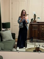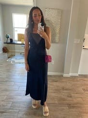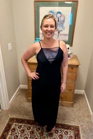 Amazing fit and fabric. Was completely out of my comfort zone but I just loved the way it felt and how I looked. That being said, figuring out the bra situation was a real challenge. I ended up going no bra and just wore stick on silicone covers but was a bit “out there”. No risk of showing anything but something to consider before choosing this for sure. I absolutely loved the leg slits on the side and the mesh was the perfect detail to make this feel more unique. Wore to a rehearsal dinner and got compliments all night.
