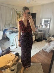 The muted colors and light velvet fabric made this a wonderful holiday party dress. The neckline is very low but it fit me so well there was never any danger of overexposure. The dress basically fit true to size but it’s definitely on the slender side for a four. if you are large in the waist or hips you should size up.