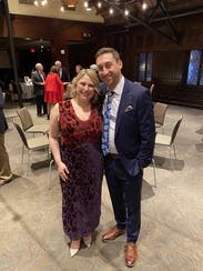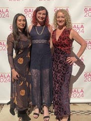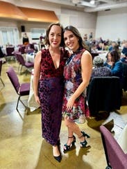 We're seriously crushing on this Marina Moscone Collective velvet dress styled with a V-neck and bold print.