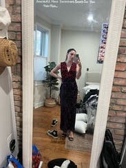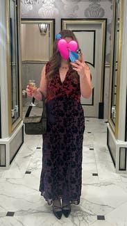 I wore this dress to a December wedding and it was perfect. Super comfortable and on theme with the color. I loved the embroidery of the black velvet lace. A very elevated look but fit super nicely. The V cut is just low enough so edgy but appropriate. No problems and many compliments!