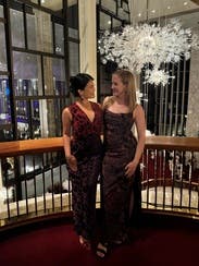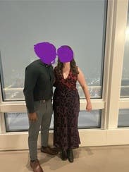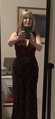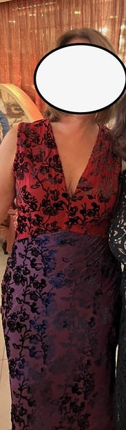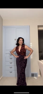 Loved this dress! The velvet overlay makes it a great choice for winter. Lots of compliments on it. The review about the bottom of the dress being narrow was right on. It’s a little difficult to move quickly or take long strides when walking, but dancing was not a problem. I rented a 2 and a 4 and wore the 2. Would highly recommend this dress!!