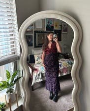 I got this dress for a Valentine's Day dinner date, and I loved how it fit. It was so comfortable and stretchy, the fabric hit my curves (especially my hips) in all the right ways, and I wasn't worried about my stomach. I think the red/black + purple/blue combo of the fabric/velvet is stunning, too. I wore a normal bra with it no problem, but with a smaller chest, the dress moved around a little bit under a jacket. I considered using fabric tape to keep it in place but didn't in the end; I think I was more worried about it than was warranted. I would definitely wear this again!