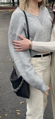 Love it, cropped but not too much. Would buy if I didn't already have a similar grey sweater.