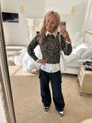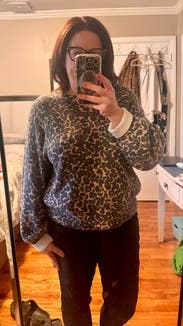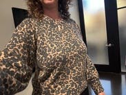 Loved this sweater! Animal print so fun! Wore with T.W.I.N. White shirt and T.W.I.N. Pants and loved it for a warm look without a coat:) size down for perfect fit or regular size for a bit bigger fit