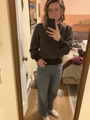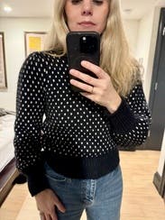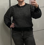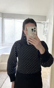 I loved the fit of this sweater and wore with high waisted pants. The shoulder puffs on the sleeves and the white spots gave it some interest. It was really warm. I found it to be soft but a little bit itchy by the end of the night.