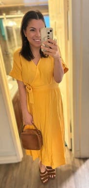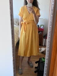 Absolutely loved the color and this was incredibly cute on. But a wrap dress is not really a functional garment, and this like many others was basically a robe you had to wear over something else. I garment-taped it in about 5 places to a nude slip (which is also helpful ai de it’s a bit sheer), otherwise it wouldn’t have stayed shut at either top or bottom. Looks easy, but is the opposite of easy. Kind of a fail, or at least a farce.