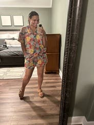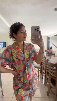 Wore this set multiple times and received many compliments. Perfect for a beach vacay. I rented the two piece set. I’m 5 ft 1 tall, 118 lb and rented the small in both the top and bottom. I wanted a loose, comfortable fit and it was perfect. Loved the colors and print for a beach trip to Florida.