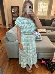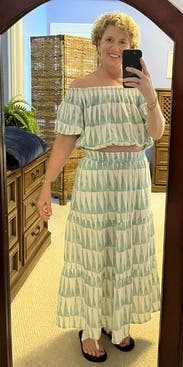 This was a bit more cropped than expected. Was great as a set, but it was too cropped to wear with denim. (Mom of 3, I don’t show my mom tummy more than a sliver) The top gathering was very stretchy, it wouldn’t stay pulled down over shoulders, it wanted to constantly creep up