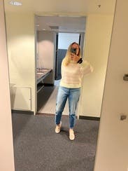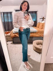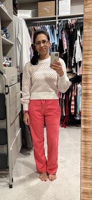 Marine layer can do no wrong in my book. Their sweaters are so cozy and functional. I wore for dinner with friends and with dress pants at the office. Great sweater with just a bit of pop thanks to the shoulders.