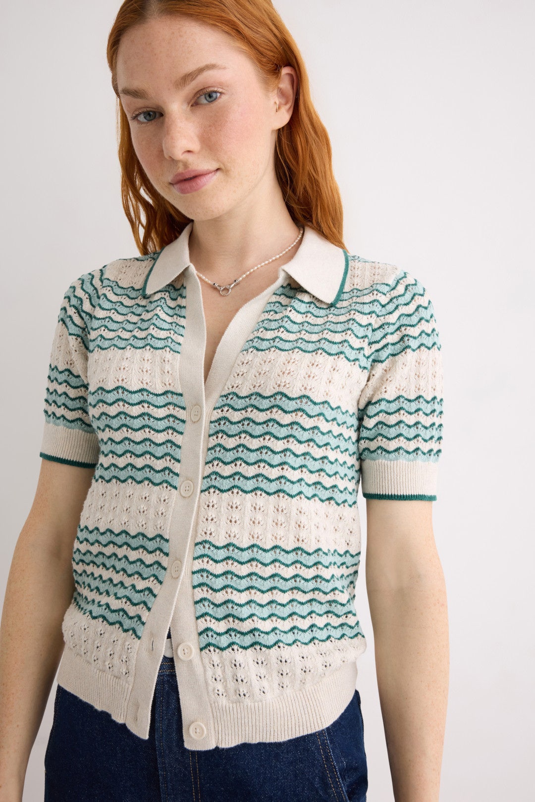 The Piper Knit Resort Shirt by Marine Layer features a striped pattern with a classic collared design and short sleeves, making it a great choice for warm-weather outfits. Perfect for relaxed weekends or a day at the beach. Pair it with shorts or light trousers for an easygoing look.