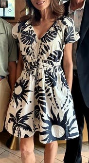 Cute, kooky print. Very light. Flattering fit. Perfect for a Summer conference in the Caribbean. I wore a camisol under it for work.