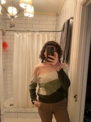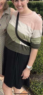 Loved this sweater! Wore with joggers for a casual night with friends and to work w nicer pants for a more tailored look. Fit a tiny bit bigger than I expected but I’m in between sizes and will always size up for fear of being squeezed!