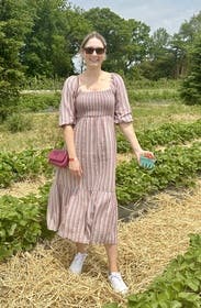 Wore this for a day of weekend errands on a hot, muggy day. Paired with gold hoop earrings, Birkenstocks, and a straw bucket bag. Wish I had taken this with me to Europe as this would have gone perfectly for a day along a coast. As others noted, the colors are more muted than expected. My husband says it looks sexier with sleeves off-shoulder, but I prefer with them up. I wore sticky cups instead of a bra since the front and back are lower and wouldn’t look great with a conventional bra.