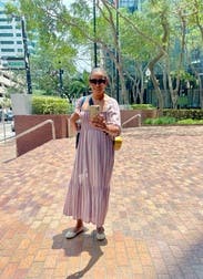 This was cute for a day of walking around. Very comfortable and has pockets which I loved. The cut of the neckline made it kind of hard to keep bra straps hidden, I had to keep tucking them back in.