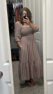 Im usually not a huge fan of these peasant dresses but this one is adorable. The colors are great and the sleeves aren’t too puffy. It’s pretty long on me so I imagine it would touch the ground for someone shorter.