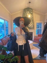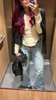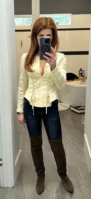 Lots of compliments on this way too low it top. Didn’t realize till the end of the night the whole thing unzips in the back so that would have been helpful for getting in and out of it. I styled with a nude cami because it was so low, I think the people who showed pics before had higher/younger/newer breasts. I needed a bra, hence the cami