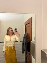 I loved this top. It was unique and flattering, allowing you to pull in the ties to make it as form fitting as you’d like. The material is on the thicker side so I was comfortable without a jacket in 50 degree weather. Would recommend pairing with tighter bottoms or a pencil skirt.