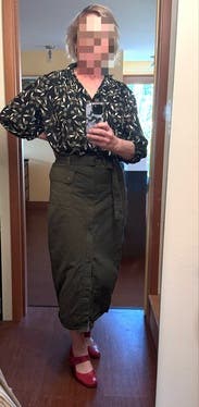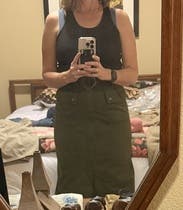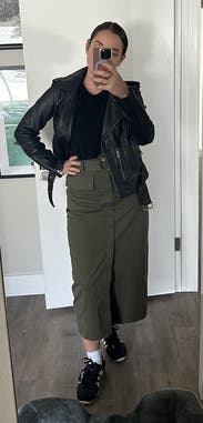 Got much more use out of this skirt than I was expecting. Was very easy to dress up/down based on the footwear and accessories you chose. Material was substantial but still had enough give to not feel too stiff. Sat at my desk comfortably for several hours and also wore it out on a full day of errands.