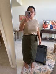 This olive green midi skirt from Marissa Webb Collective features a high-waist design with a stylish belt and utility pockets. The skirt's structured silhouette lends a sophisticated yet functional feel. Pair it with a fitted turtleneck and strappy heels for a balanced, modern look.