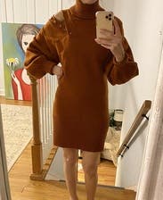 From the shape, weight of the sweater, color, sizing, details - all of it - this really was the perfect sweater dress. Wore for vacation in Montana and back home shopping around Dallas. Lots of compliments. It was really cute with the shoulder unbuttoned too! I sized up to medium because I hate tight sweater dresses but I think I would have been fine with a small. Rent this!