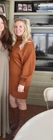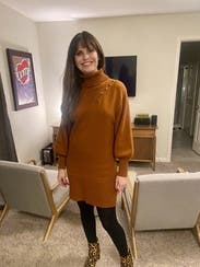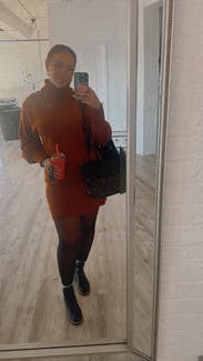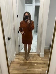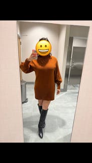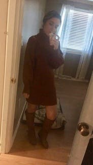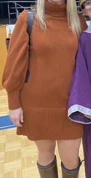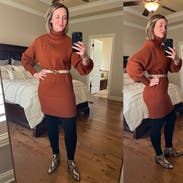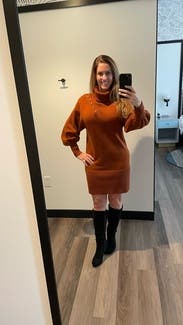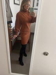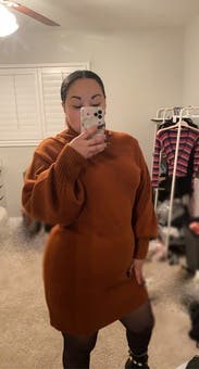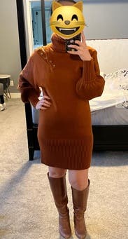 The sweater dress is a cute comfortable design and a great color. I wore it to a few dinners and got lots of compliments. It is a thick knit so make sure you won't be in a hot place! I wore it on a cooler night and worked out well.