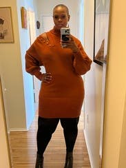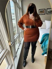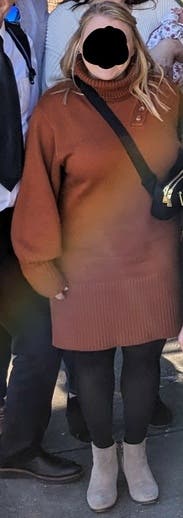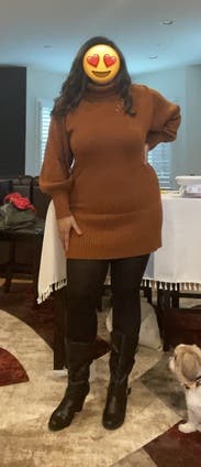 This fit perfectly. Looked like an oversize sweater on top with the right amount of fitting along the leg line. It looked amazing with knee-high black boots, and I got so many compliments on the fall color.