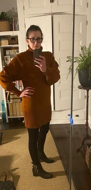 This is the perfect cold weather dress! It’s a great fall/winter color and is extremely comfortable. Wore to a birthday party and to wore. Easy to dress up or down. The balloon sleeves give it a little character, while not going crazy.