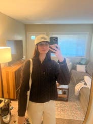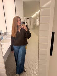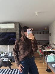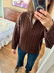 If you're looking for a versatile sweater to take you from winter to fall, this brown quarter-zip is a must-have. The mid-weight knit provides just the right amount of warmth for chilly mornings without feeling too heavy as the day warms up. The fabric is soft, not scratchy, and layers effortlessly over a tee or under a jacket. The fit is flattering—relaxed but not oversized—making it easy to dress up with tailored pants or keep casual with leggings or jeans. The rich brown shade is neutral yet stylish, pairing well with everything from denim to autumnal tones. The quarter-zip detail adds a polished touch and allows for adjustable coverage depending on the weather. Overall, this is a great staple for anyone who wants an easy, stylish layering piece for the changing seasons.