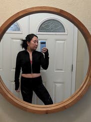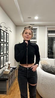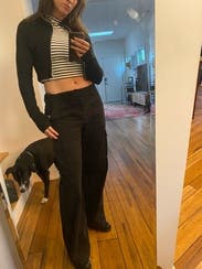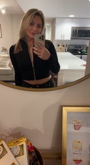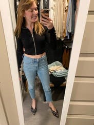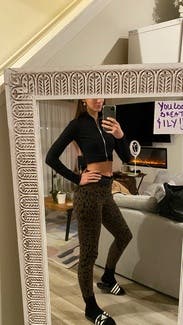 This cropped zip up is the perfect mix of casual and cool. I love the athletic material that is easy to keep clean.