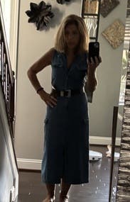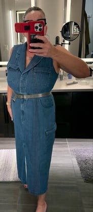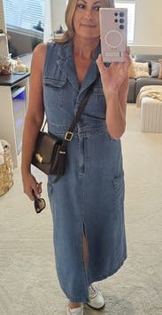 Chic denim dress that fit very nicely and felt dressed up with a cinched belt and heels for a work party. The midi length felt classy and age appropriate.