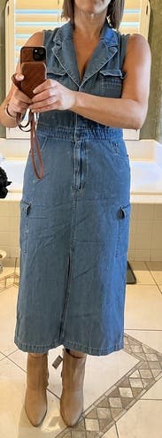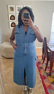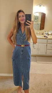 This was comfy and accentuated my waist and showed just a bit of cleavage. Denim is soft and not stiff. Slit in leg felt too high for work while sitting. Lots of fun to wear out and about- got several compliments. Would def rent again!