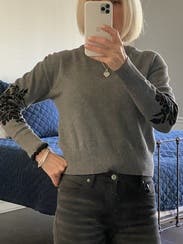 This was a basic sweater but the embroidery on the arms added interest. Great for work or casual.