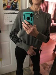 This is a basic grey sweater but the detail on the arms jazzed it up. Perfect fit and length. Lots of compliments! Will rent it again this season.