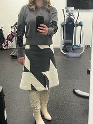 I wore this many times - paired here with a Jason Wu skirt I rented, also wore to work, thanksgiving, etc. fit was perfect - loose enough that it was comfortable , but not bulky. Liked the shorter length too versus so many sweaters that are just way too long.