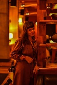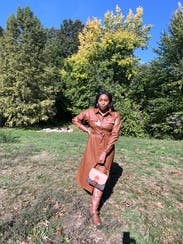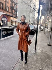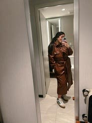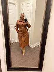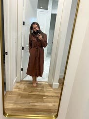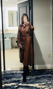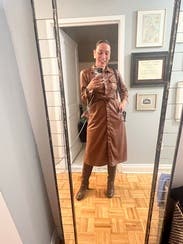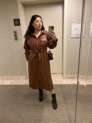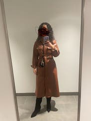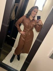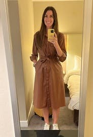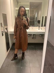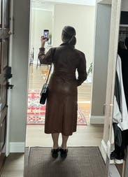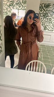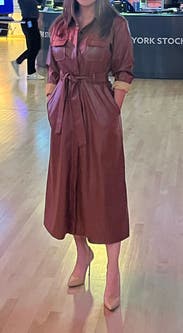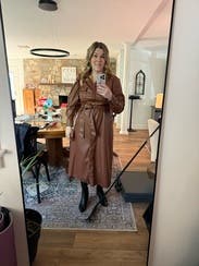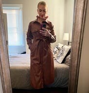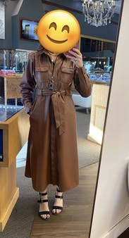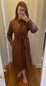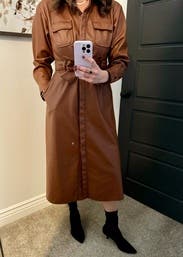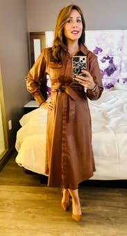 WOW! What a fantastic dress! I wore this to host a large meeting at work and got dozens(!!!) of compliments from men, women, strangers… everyone! It has pockets galore (huge crowd pleaser among women!), has a bit of a slit so it’s a sexy without being revealing given the length. Color is a gorgeous cognac brown. Waist it fitted and the belt adds even more of a pinch. The only thing to keep in mind is that it is a fabric meant for cooler weather - I would only wear this on a day that’s below 40F or you’ll feel damp/sweaty. Overall, this dress was a showstopper for a chilly winter day in NYC! 10/10