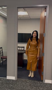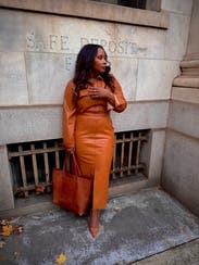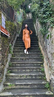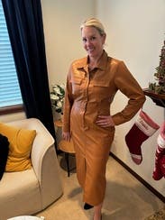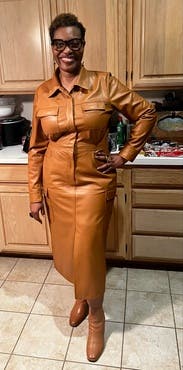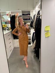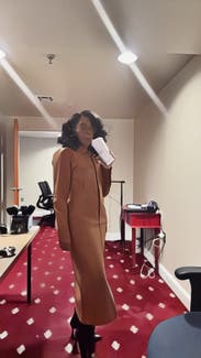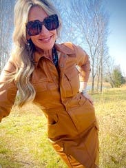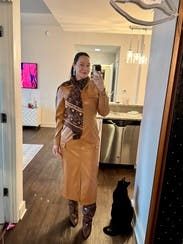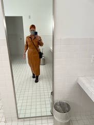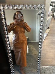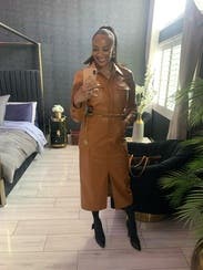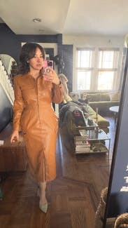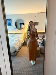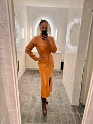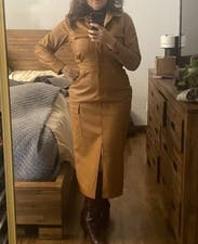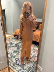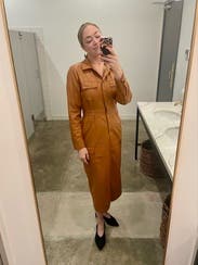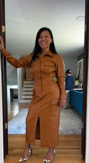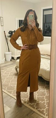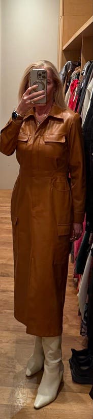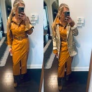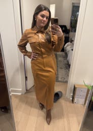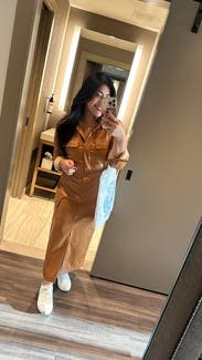 This dress was an absolute hit at the wedding! The rich caramel color and faux leather material gave it a sophisticated yet modern edge. The tailored fit, structured design, and front slit added just the right amount of elegance and movement. The utility-style pockets provided a trendy touch, making it both fashionable and functional. It was comfortable to wear throughout the event, and the compliments kept coming all night! Paired with the statement boots, gold accessories, and designer bag, the look came together perfectly. If you’re looking for a chic, bold, and classy outfit that stands out, this dress is a must-have!