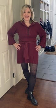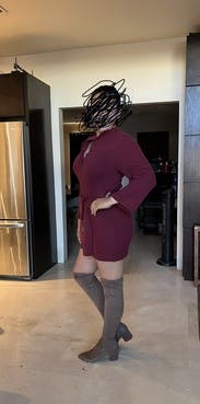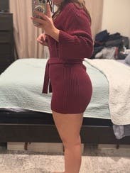This dress feels amazing, not only the material but the fit and completely comfortable. Wearing the dress with boots as pictures is so sexy! I would buy this dress in a heartbeat if it were brand new.