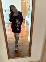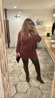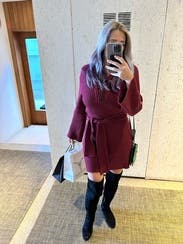 This burgundy henley dress by Marissa Webb Collective gives buttoned-up polish when tied at the waist with chocolate knee-high boots and gold jewelry.
