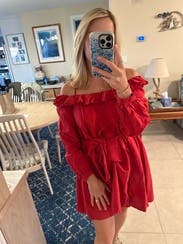 I had rented the same Marissa Web Collection dress in another color last summer (Orange Cold Shoulder Dress) and it was one of my all-time favorites so I was excited to rock this in red. Ultimately, I wasn’t as obsessed — for some reason, the ruffles down the side stood out more in the red and I found them to be a bit much. Otherwise it was a solid rental — cut is great, and the fabric is heavy enough for end-of-summer or an evening out.