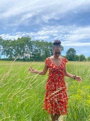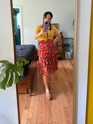 I don’t think a dress has ever made me look better in my life! Obsessed with this dress and can’t let go of it. Perfect vibrant colors, lovely shape, so flattering, so comfortable (wore for 12ish hrs straight).